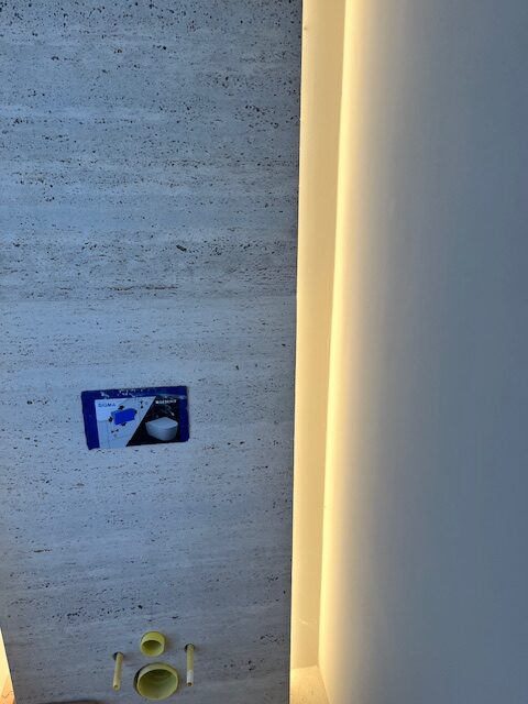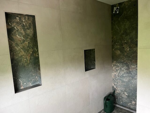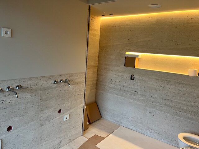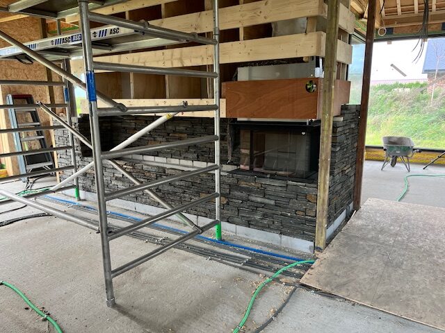 Podium visgraat laminaat met steen strip achterwand te Groningen